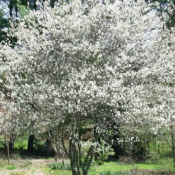 Serviceberry (Amelanchier canadensis) – A versatile native ornamental tree that grows best in well-drained soil and full sun to partial shade. Delicate white flowers appear in early spring before foliage emerges, followed by edible blue-purple berries that attract birds. Leaves emerge bronze, mature to deep green in summer, and finish with vibrant orange to red fall color. Growing 15–25 feet tall with a graceful, multi-stem habit, it’s ideal for naturalized landscapes and specimen plantings.